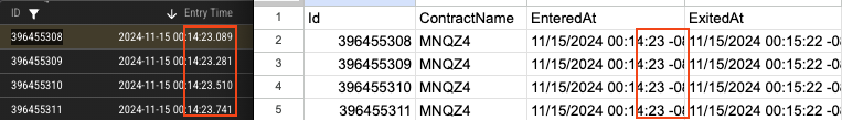 I want the orders panel and trades panel to export CSVs with timestamps accurate to the millisecond