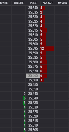 The bar length for the 6 contracts on the ask side (red) vs on bid side (green) are not looking equal visually. This is may be down the queue line there’s large contract on the bid side that has scaled down the numbers in bar chart.