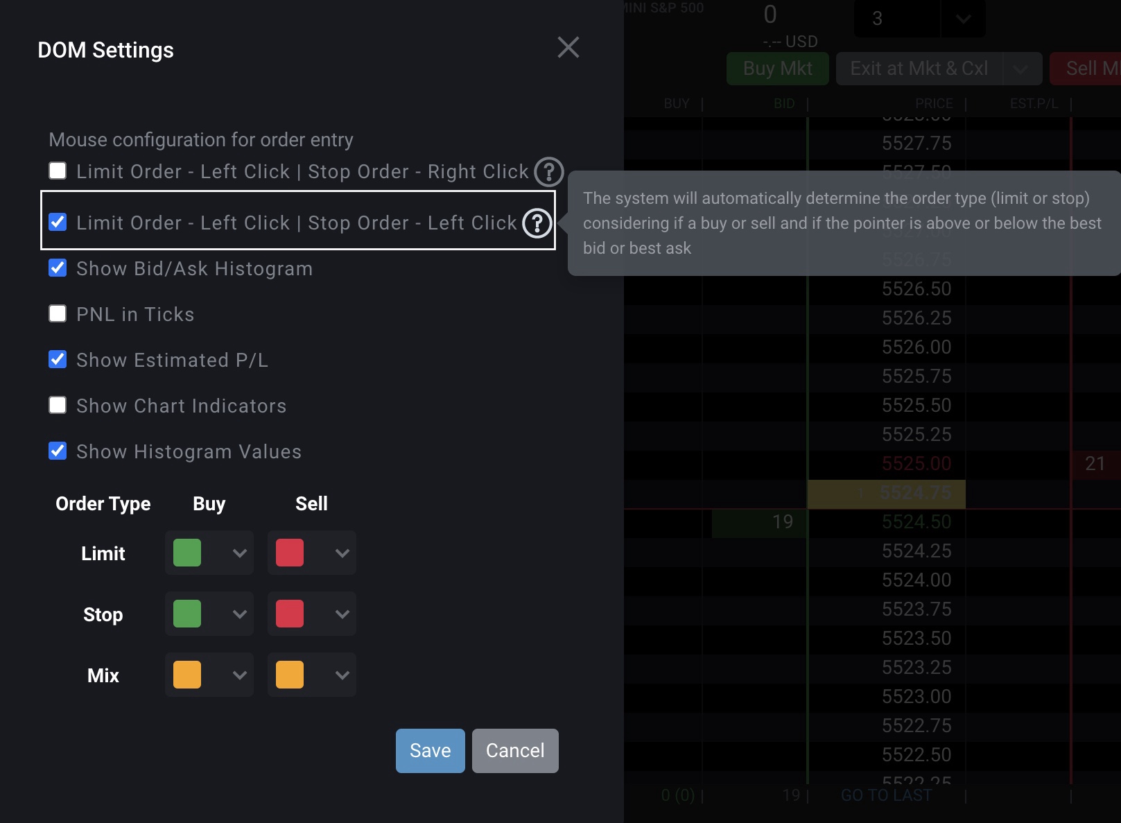 The ability to left click anywhere on the DOM and the system will automatically determine the order type. On multiple occasions i entered a trade incorrectly on the TopStepX DOM because i would forget if i i should left click or right click on mouse to choose correct order type.