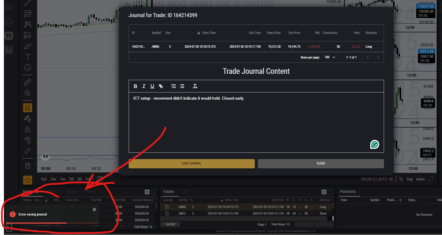The journal feature times out after a browser is open for a period of time - while trading. After refreshing the page the journal entry can be saved.